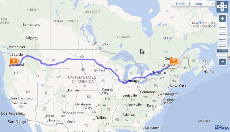 Yahoo! Maps shows the distance, Portland to Montreal: