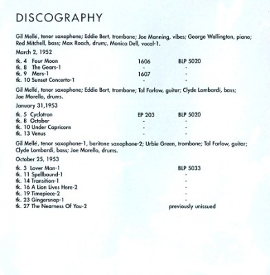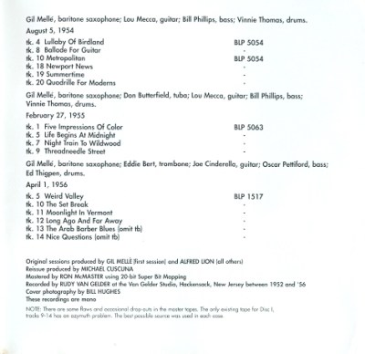 The recording engineer for all sessions was the legendary Rudy Van Gelder, whose career was given a gigantic boost by Melle when the musician introduced him to Alfred Lion, founder of Blue Note Records. Van Gelder went on to record nearly every session Blue Note session between 1953 and 1967.